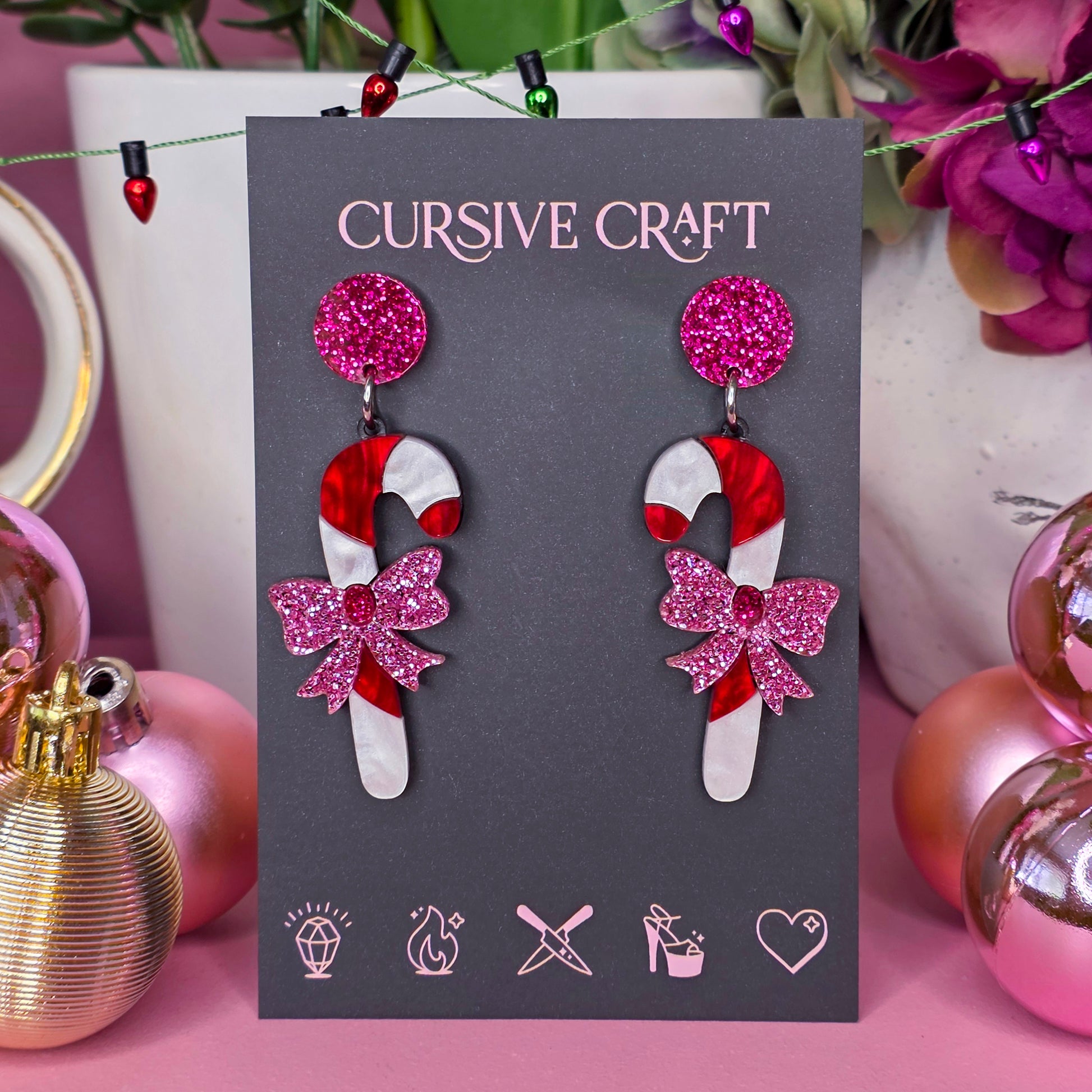 Serve sweet festive sparkle with Candy Cane Cuties. Glossy red-and-white acrylic candy canes topped with glittery pink bows and matching pink glitter studs. They’re bright, fun, and full-on adorable, while still being lightweight enough to wear all day.
