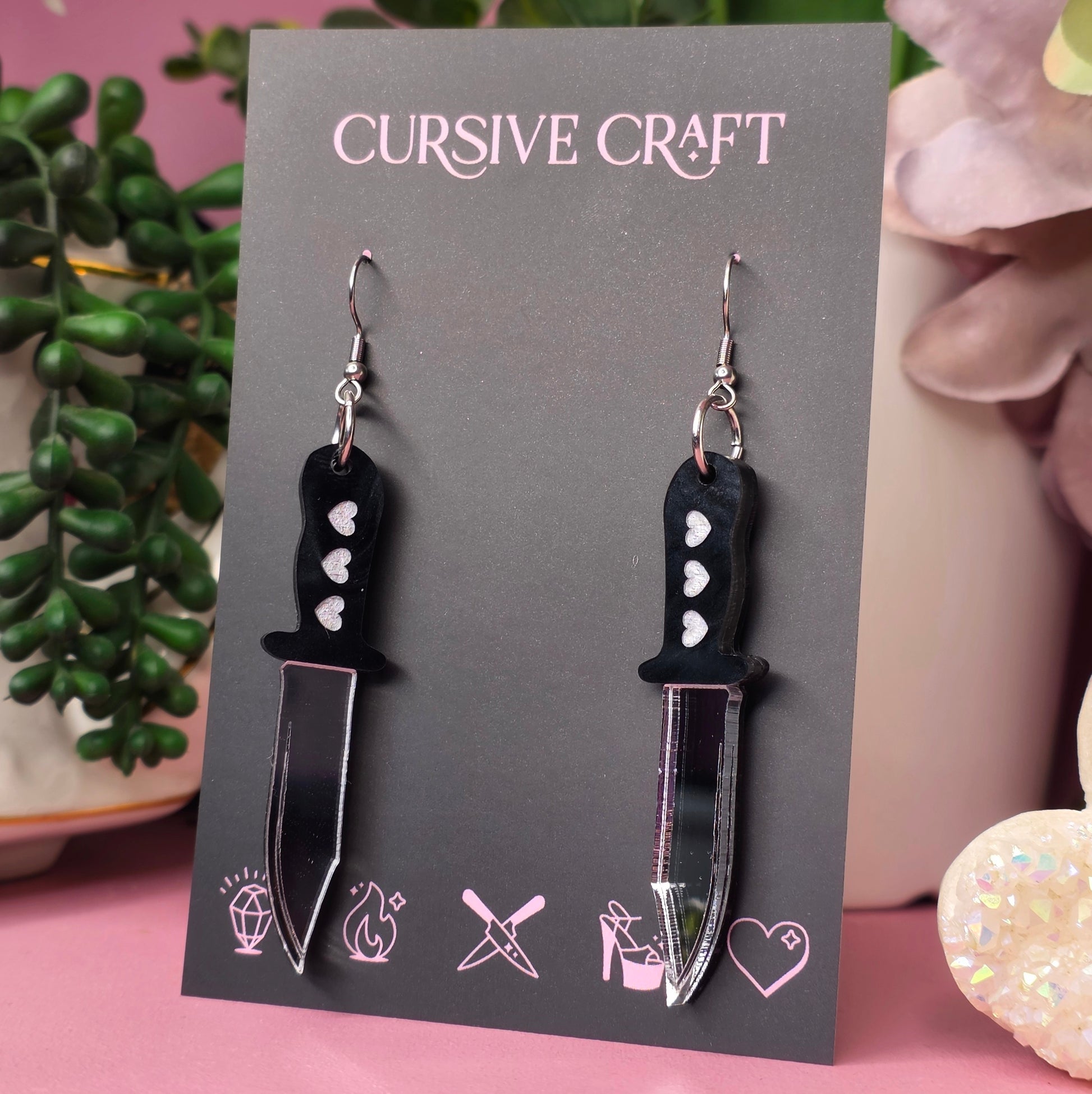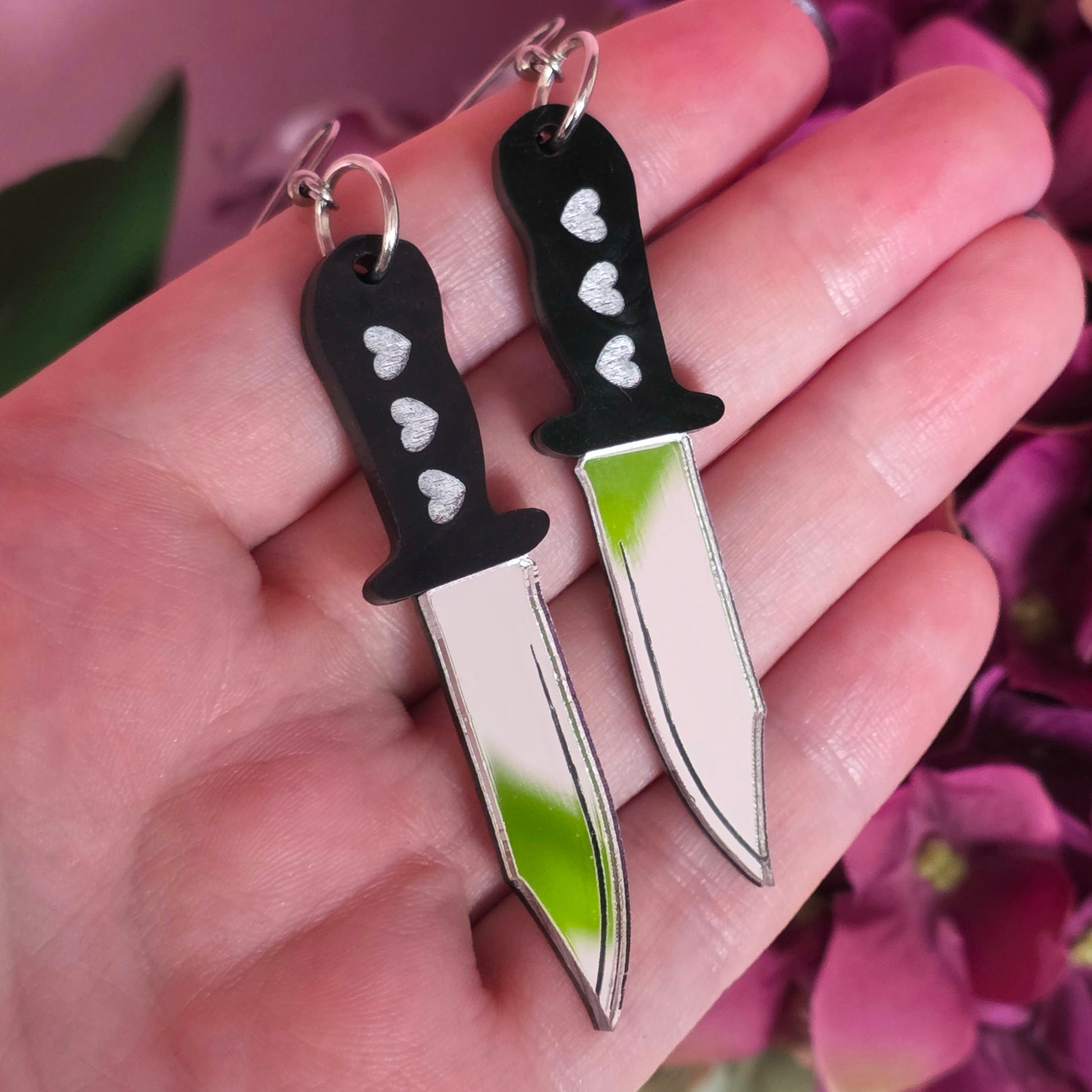 These monochrome dagger earrings strip the sweetness right back and replace it with pure intent. Featuring black handles with engraved heart details and high-shine silver mirror blades, they’re bold, graphic, and unapologetically threatening.