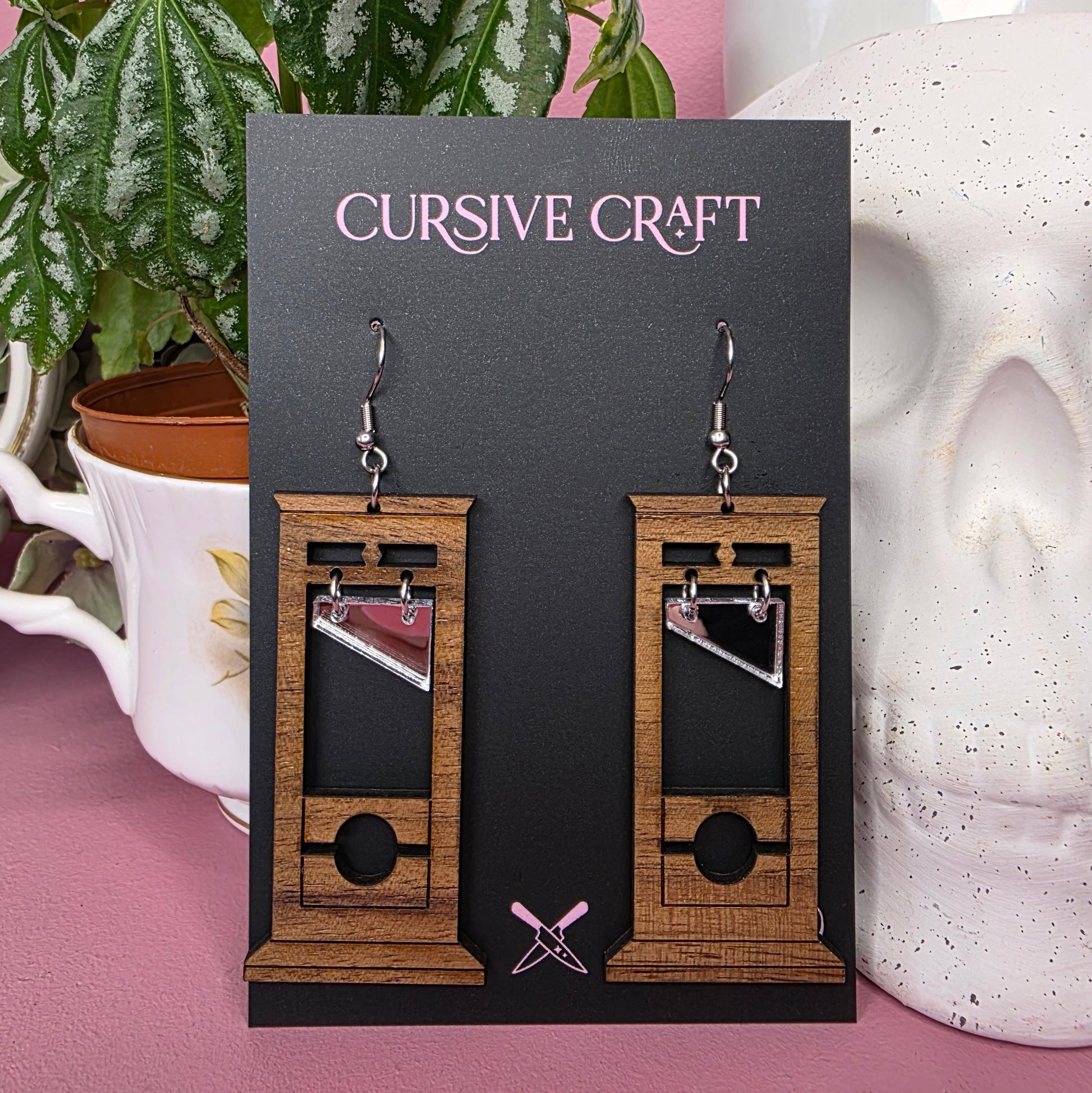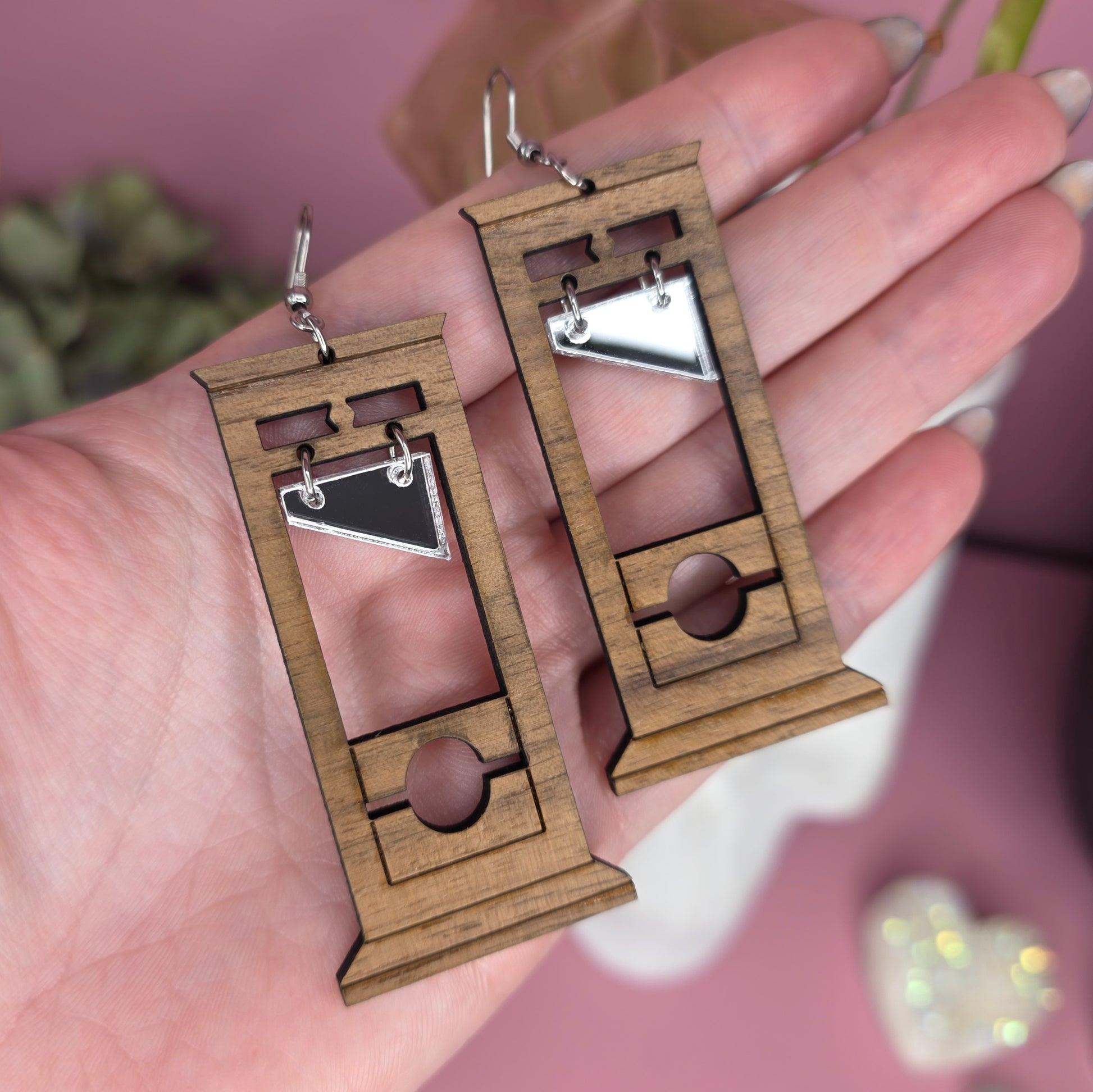 These laser-cut guillotine earrings are darkly dramatic with just the right touch of shine. Made from rich walnut wood and finished with a mirrored acrylic blade, they’re perfect for spooky babes, history nerds, and anyone who loves their accessories with a little bite.