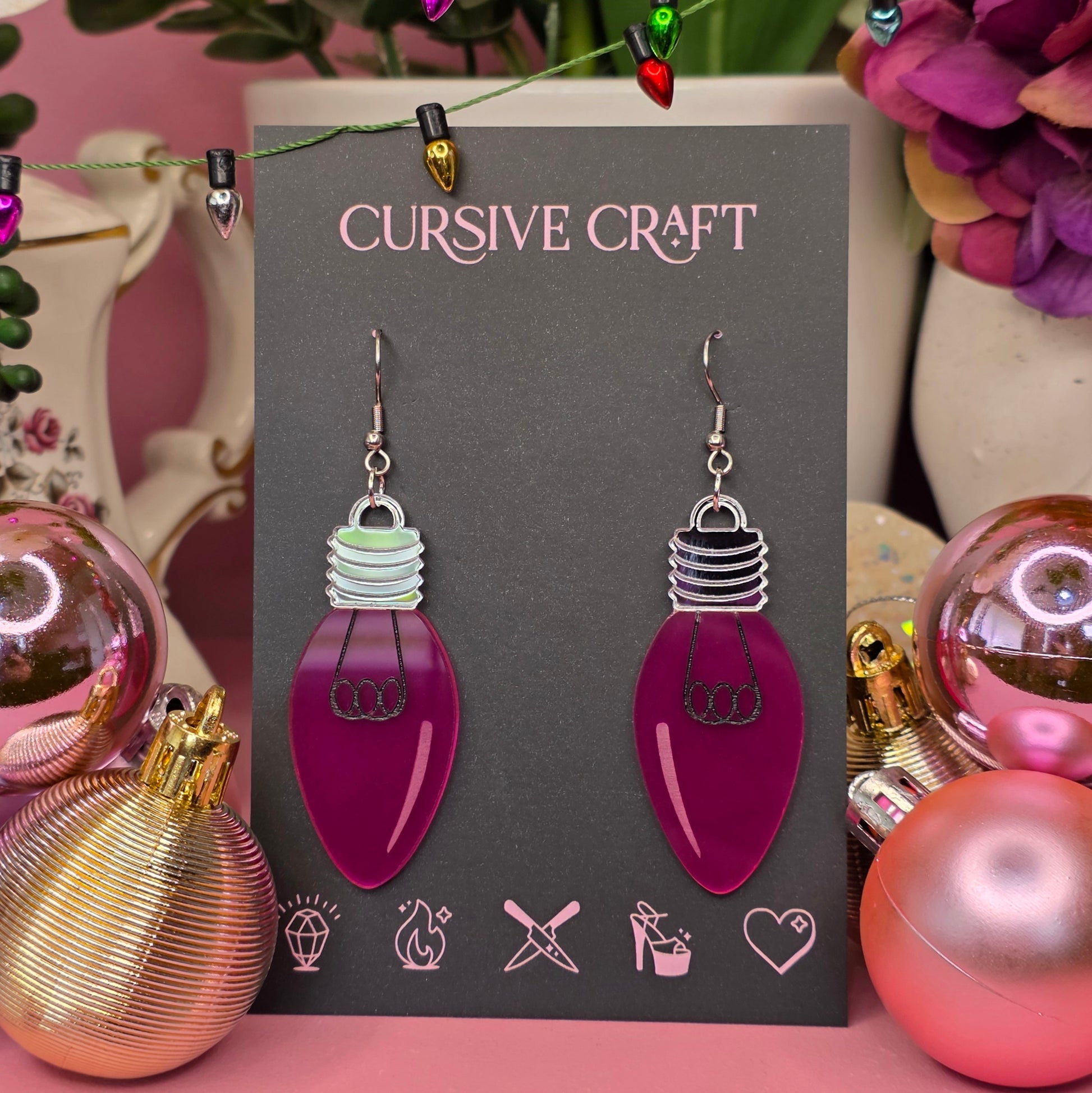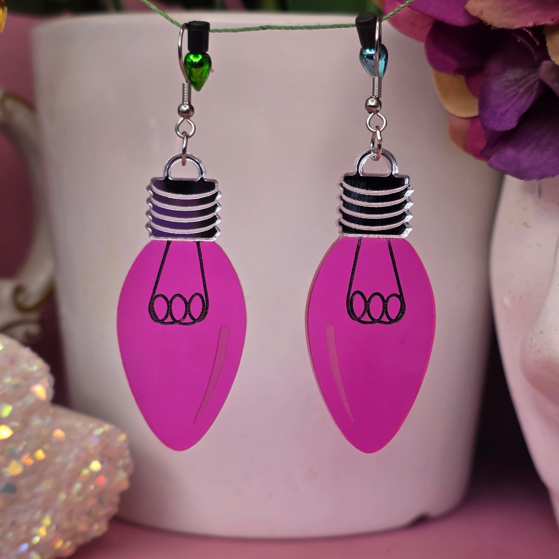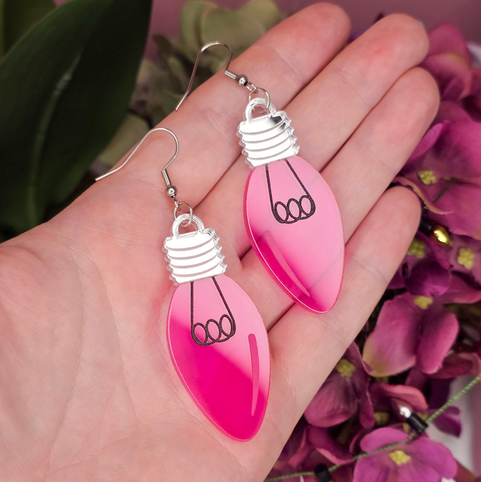 Brighten up your festive look with Holiday Lights. Glossy acrylic Christmas bulb earrings in a gorgeous translucent pink shimmer that catches the sun like crazy. These lightweight beauties are a summer Christmas essential: cute, colourful, and perfect for everything from BBQ season to boozy end-of-year parties.