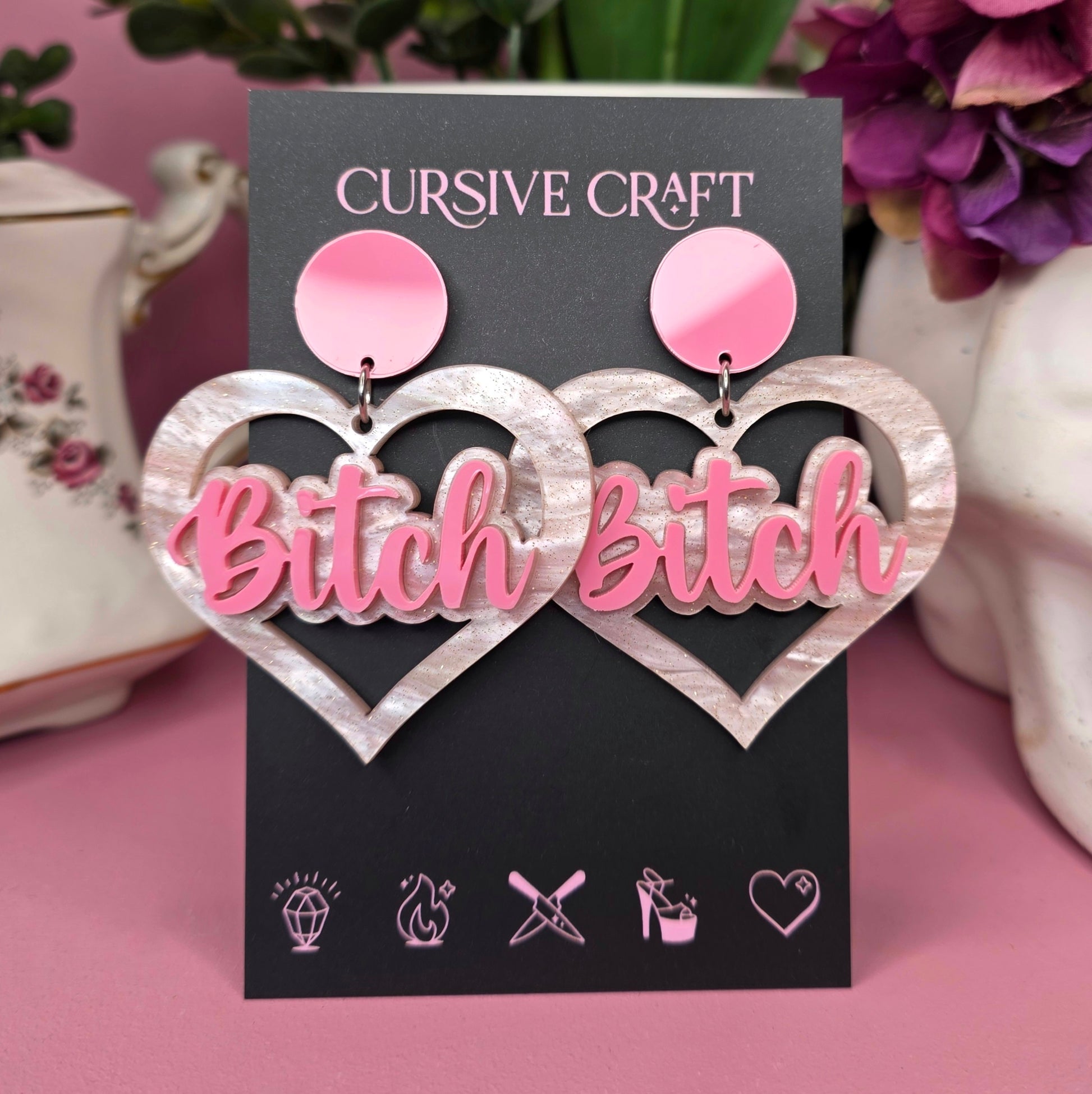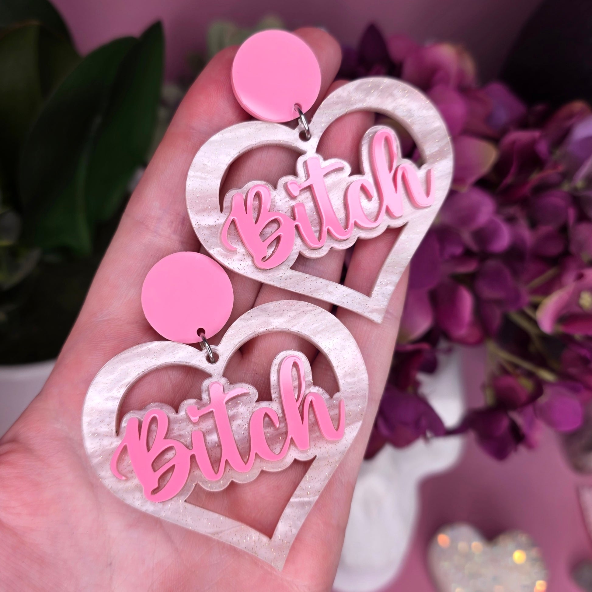 Because sometimes the sweetest accessory is a little bit savage. These bold AF acrylic statement earrings spell it out loud and proud: Bitch… but make it cute.