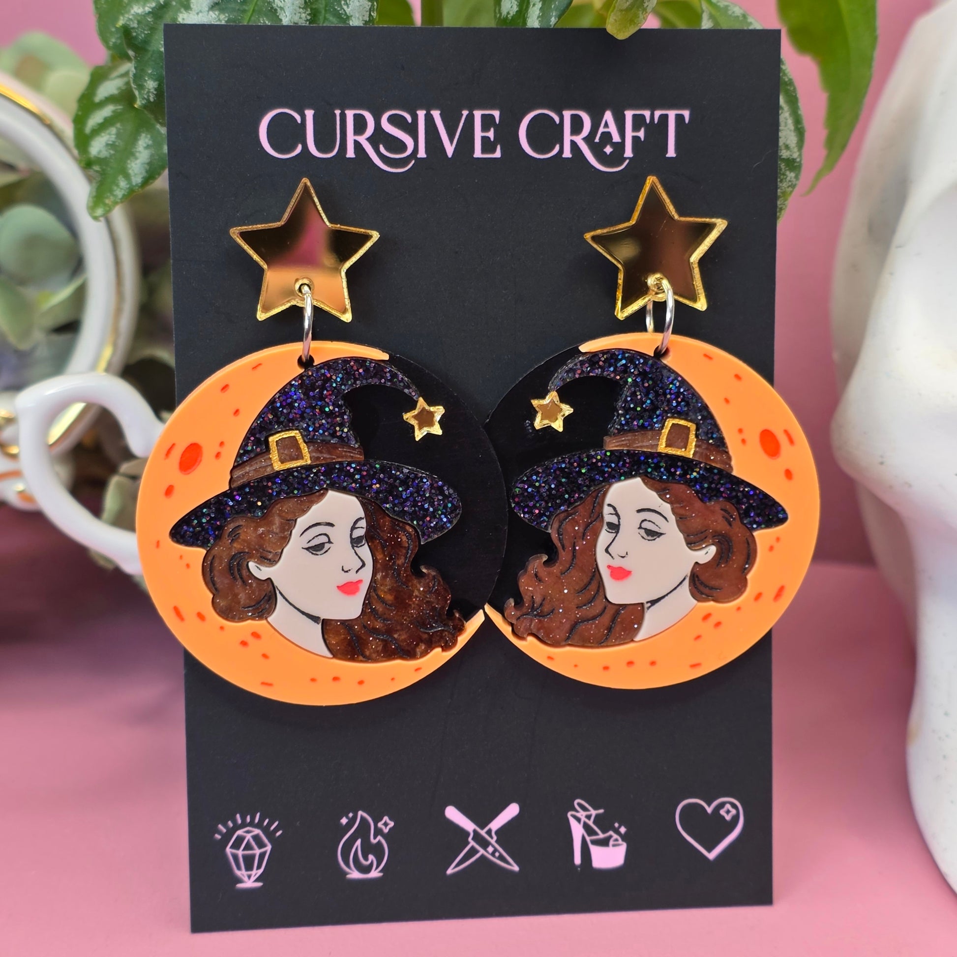 Meet our Spellbound Witch Earrings, a dazzling mix of retro glamour and spooky magic. Each pair features a vintage-inspired witch with flowing caramel hair, perched against a glowing orange moon and finished with a glittering black hat topped by a golden star.