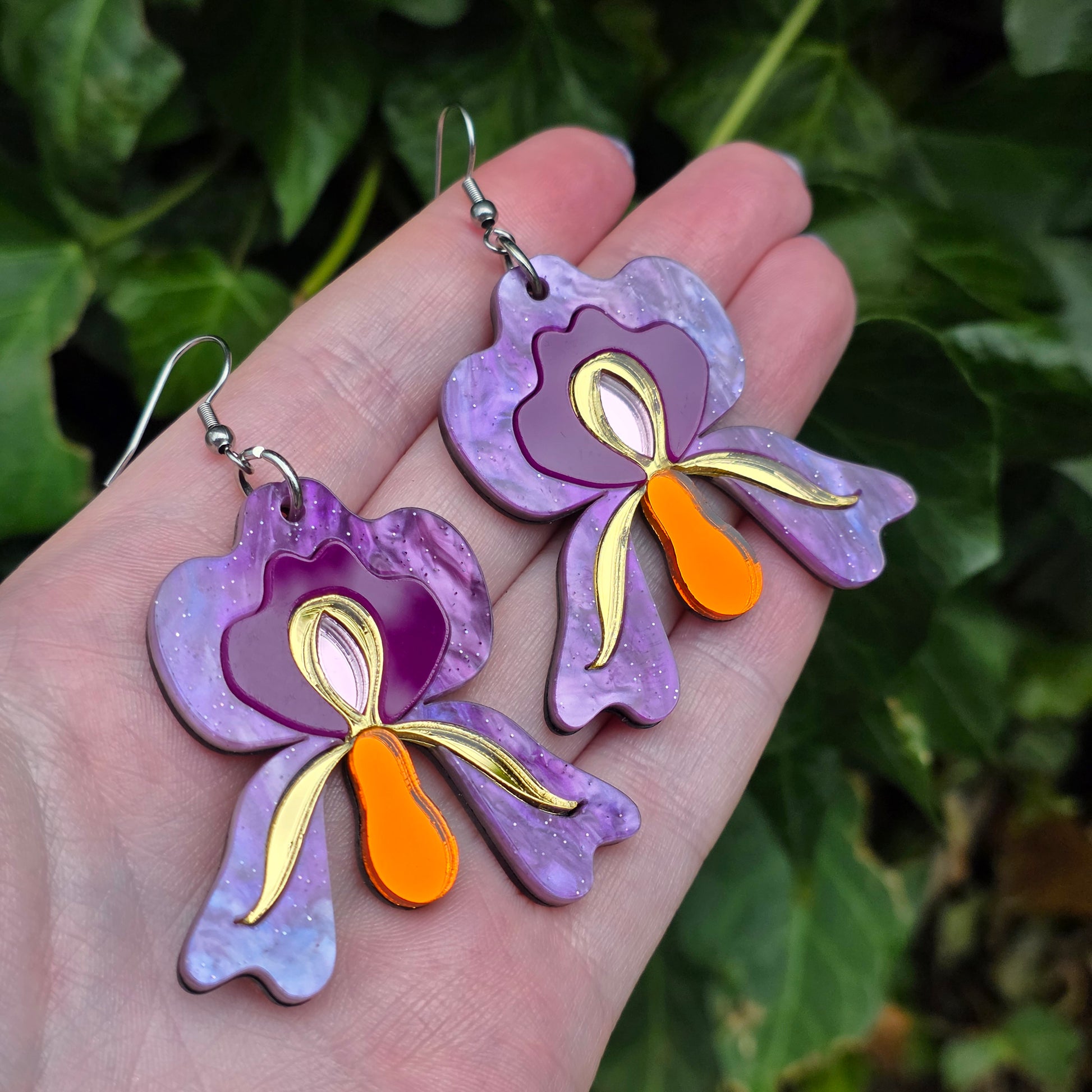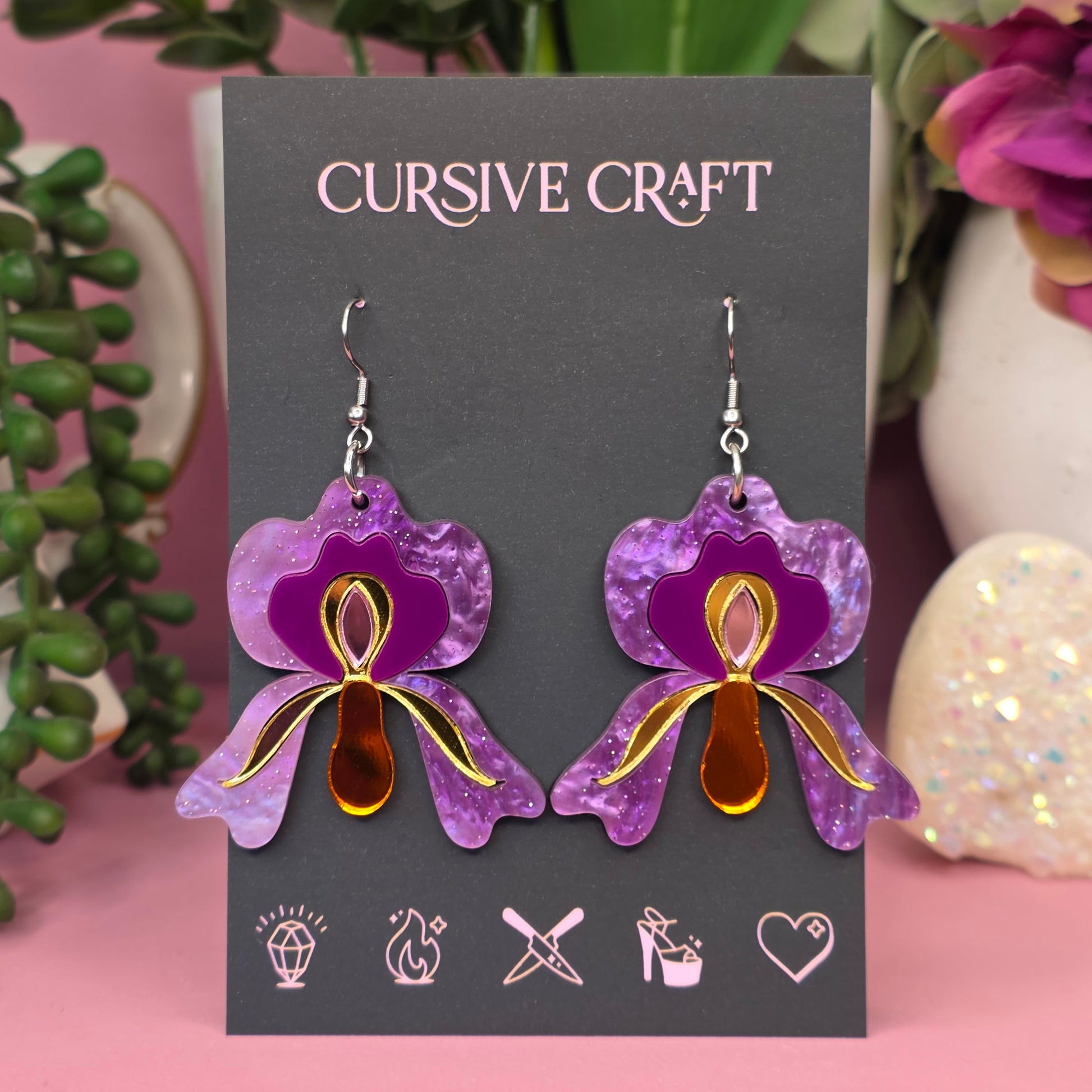Layered in rich amethyst purples with gold mirror detailing and a warm amber drop centre, these earrings echo the shape of a blooming orchid in full “look at me” mode.